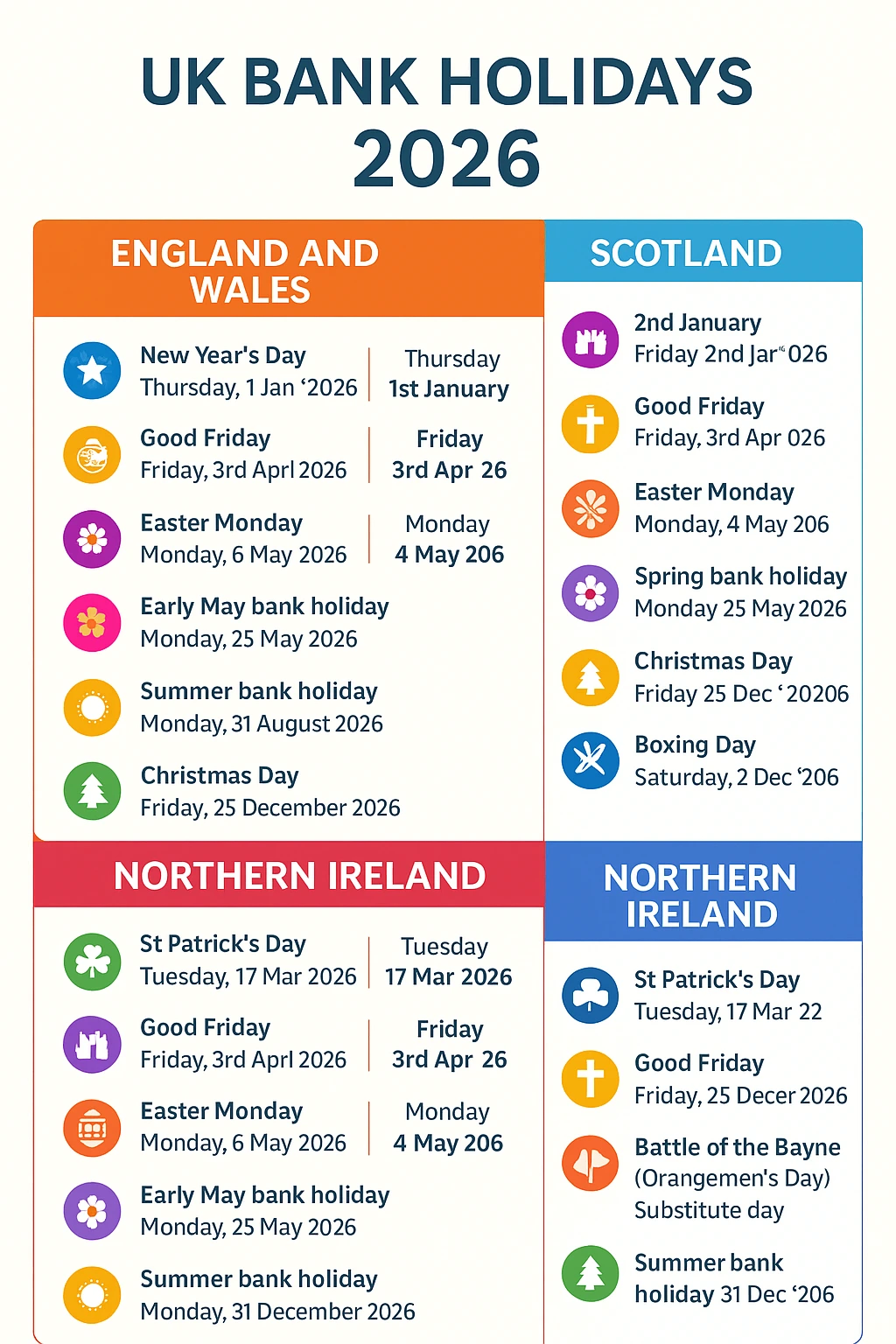 The public holidays for 2026 in England & Wales, Scotland, Northern Ireland are as follows: